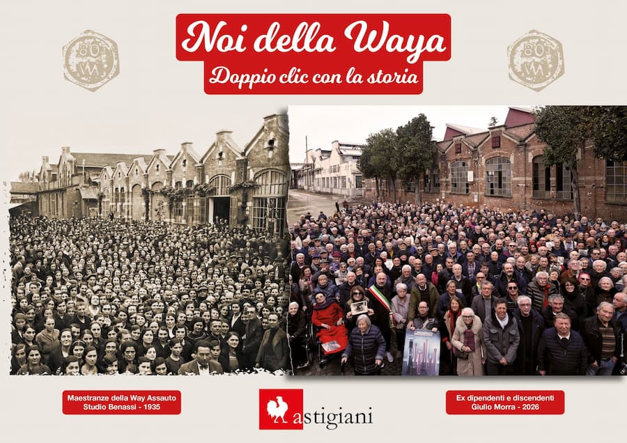 È speciale la doppia copertina: la foto scattata nel 1935 che ritrae i dipendenti Waya radunati nel cortile interno dell’azienda è stata ricreata lo scorso 28 febbraio, con centinaia di ex lavoratori e loro discendenti invitati da Astigiani. Le due immagini sono state unite in un poster ricordo che sarà disponibile alla presentazione di sabato.